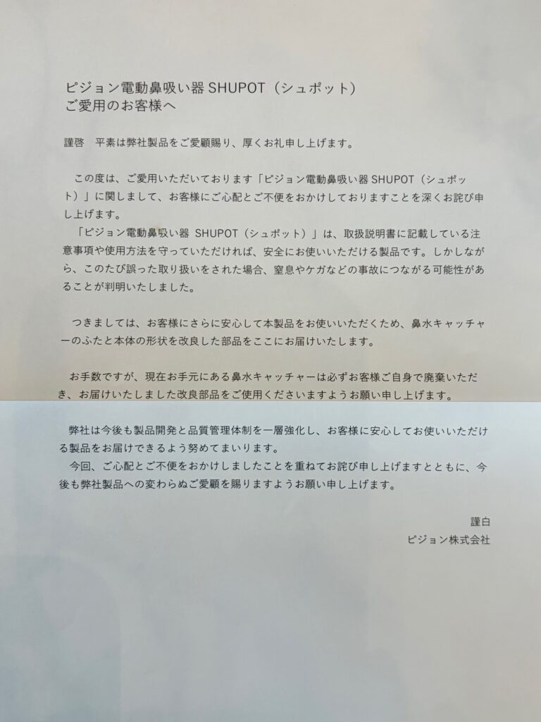 ピジョンのシュポットの部品が間違った使い方をすると危険である可能性が高いとのことで、現在無償で改良品が提供されています。(申請が必要)